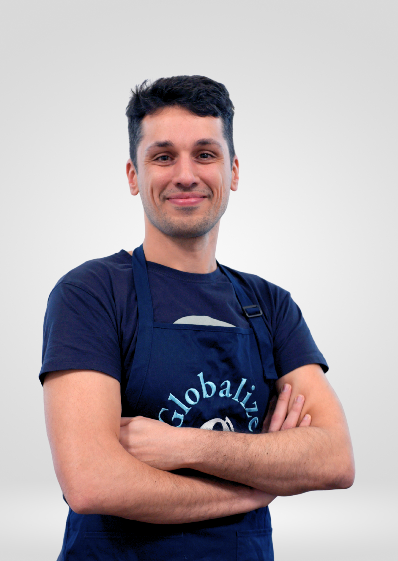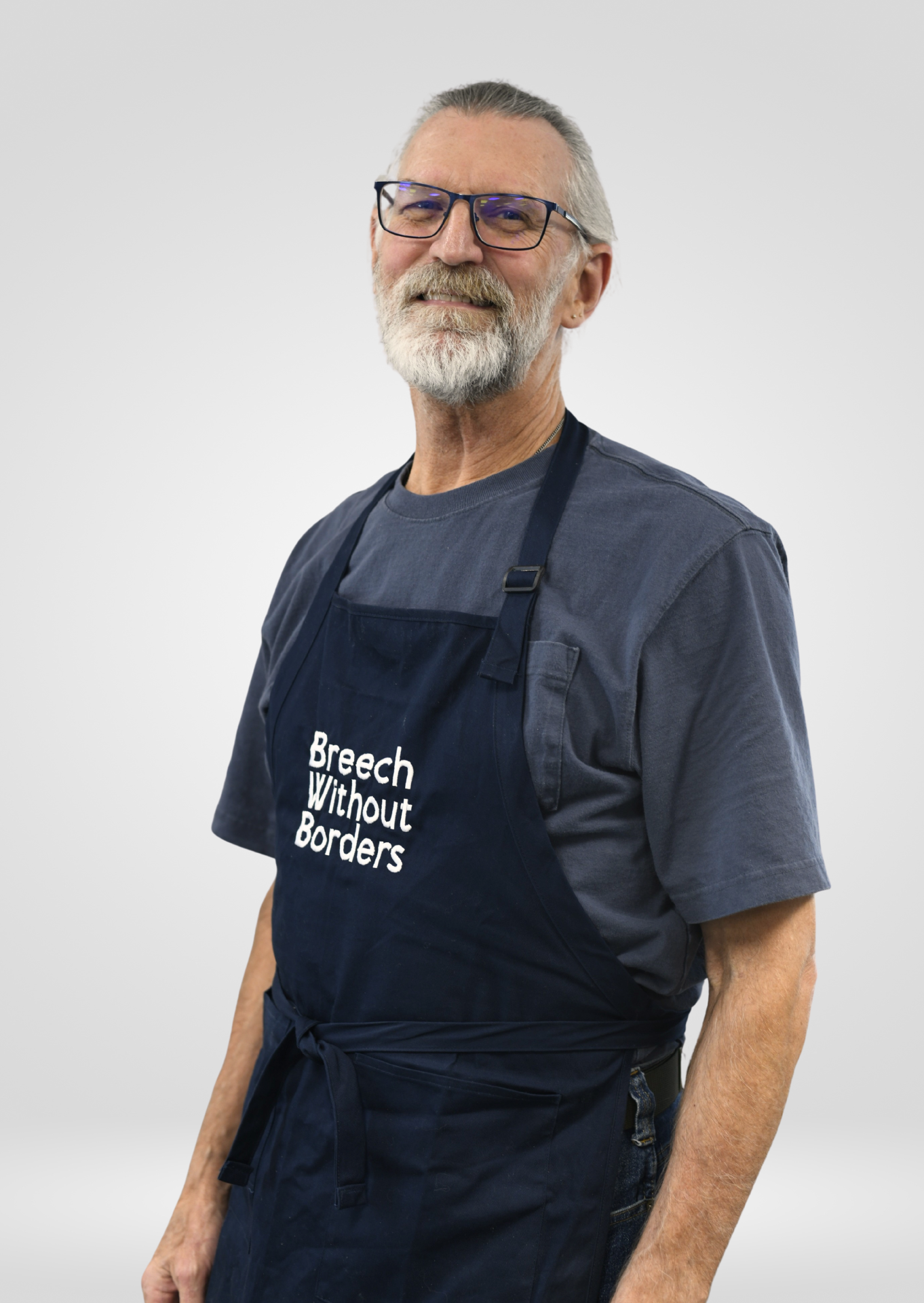 Navy blue, 100% cotton with an adjustable neck strap and 2 pockets.